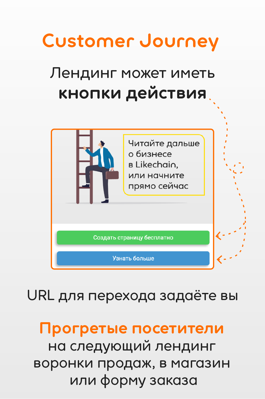 Лендинг может иметь до двух активных кнопок, URL для перехода с которых задаете вы: на форму регистрации на вашем сайте, на товар или другой лендинг Likechain, и т.д.