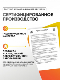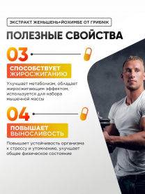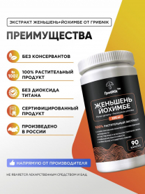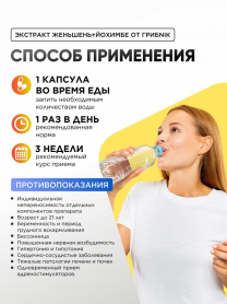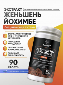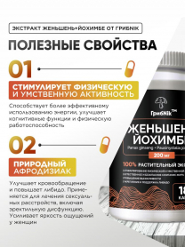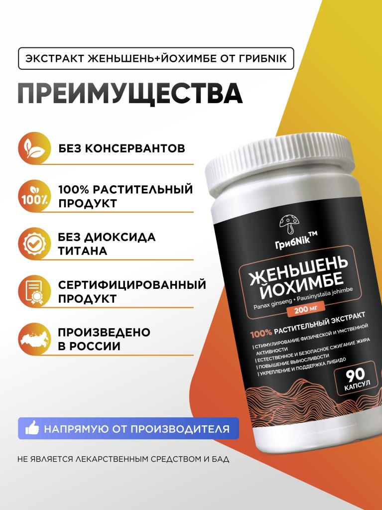 Йохимбе (Йохимбин) с женьшенем 90 капсул 200 мг, афрозизиак, для потенции, для либидо, для энергии, бустер тестостерона, ГрибNik