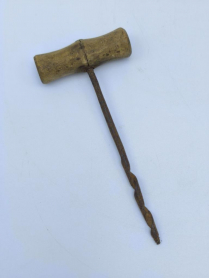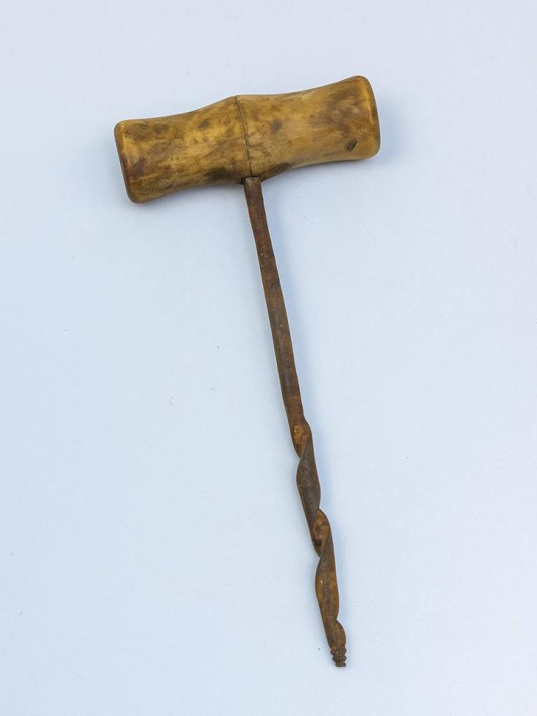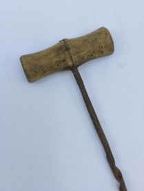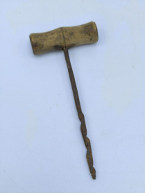 Спираль штопора выполнена из крепкого металла, который легко справляется с извлечением пробки любой плотности. Её винтовая конструкция позволяет пробке оставаться целой, избегая повреждений. Металлическая часть штопора покрыта налётом времени, говоря об истории, которой этот предмет обладает. Прочность конструкции гарантирует, что аксессуар сможет использоваться как функциональный инструмент, несмотря на его антикварный возраст.