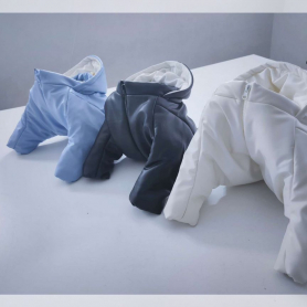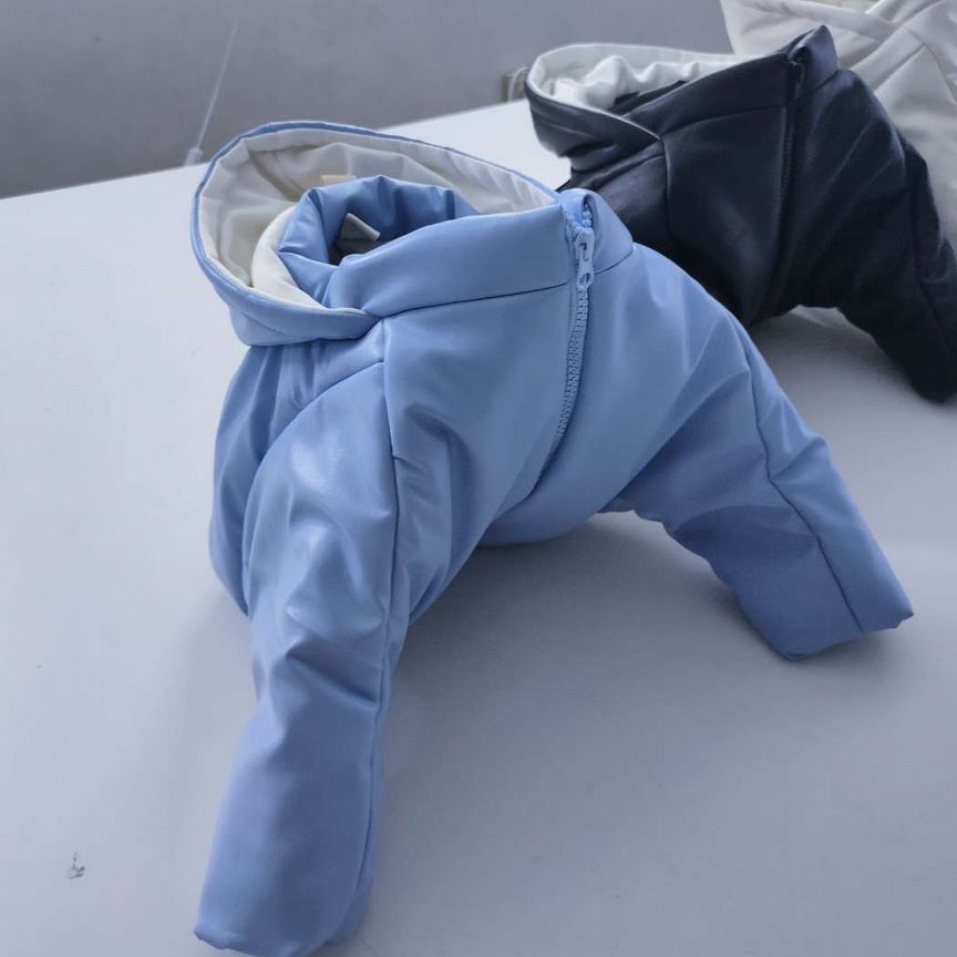 Застёжка на молнию со стороны пузика. Высокий воротник и капюшон защищают горло и ушки. На лапках и талии вшита манжета с резинкой.