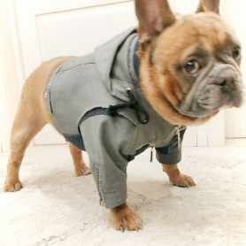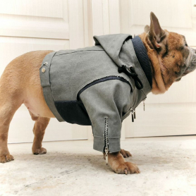 Застёгивается курточка на застёжку молнию в области брюшка. На талии вшита резинка фиксатор. Так же на талии есть дополнительные кнопки для фиксации изделия на фигуре вашего питомца.