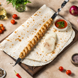 Сочный и нежный люля из курицы на подложке из тонкого лаваша и луком.