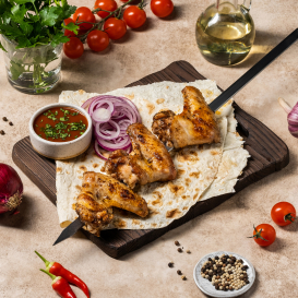 Сочный шашлычок из куриной голени, приготовленный на огне. Сочный, горячий. Беспроигрышный выбор.