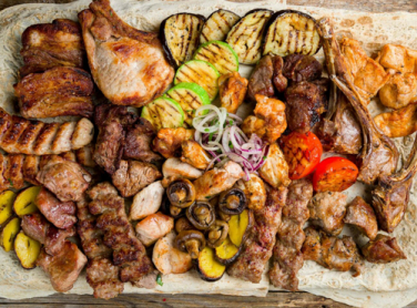 Мякоть ягненка с 5 шт, баранина на косточке 5 шт, люля из говядины 4 шт, люля из баранины 5 шт, сливочный соус 5 шт, классический соус 5 шт, пита 3 шт