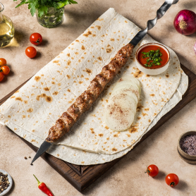 Состав: Люля-кебаб из говядины, лаваш, лук СОУС ПРИОБРЕТАЕТСЯ ОТДЕЛЬНО Вес: 150/30/30