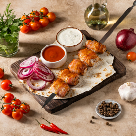 Состав: Свиная вырезка, бекон, лаваш, лук СОУС ПРИОБРЕТАЕТСЯ ОТДЕЛЬНО Вес: 200/30/30